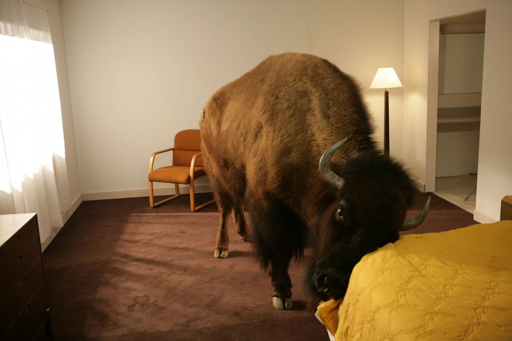 Shot in over 75 hotel and motel rooms across the country, Migration is a multi-screen projection installation that explores the transitory nature of the modern condition. In Migration, the movements of wild North American animals are transposed upon the familiar, yet oddly vacant and sterile space of modern roadside hotels and motels. The animals interact with these familiar but anonymous pattern of interiors that make up the contemporary American landscape. The film alternates between multiple billboard screens allowing the viewer to determine their own vantage to experience the beautiful and haunting visuals and amazing score composed by Robert Aiki Aubrey Lowe. The piece has been installed in multiple locations as exterior projection mapping as well as onto custom-manufactured roadside billboards.